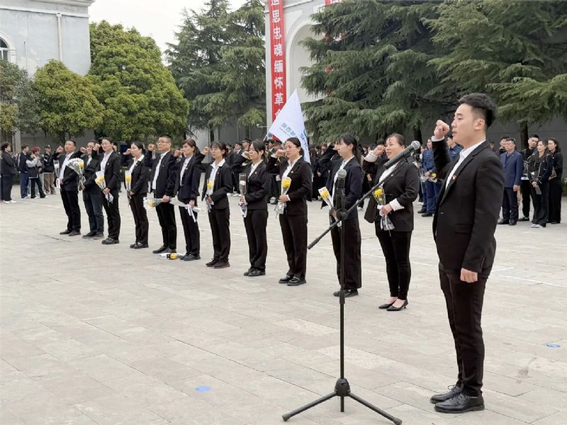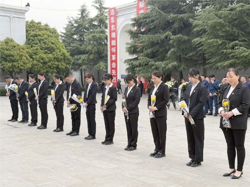 上午十時,烈士陵園松柏蒼翠,豐碑巍峨。全體人員肅立紀念碑前,高唱《中華人民共和國國歌》。激昂的歌聲回蕩在陵園上空,訴說著對祖國的赤誠與對先烈的敬意。隨后,全體人員低頭默哀,一分鐘的靜默,承載著對英烈無盡的追思。默哀畢,黨支部書記徐金強代表全體人員向革命英烈敬獻花籃,他仔細整理挽帶,深深地向紀念碑鞠躬,良久方才起身,寄托對先烈的無限追思與崇高敬意。