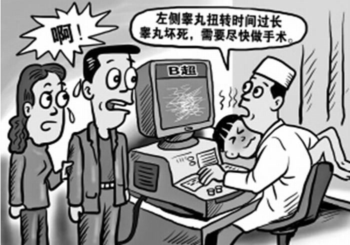 今年8月的一天,一位20歲的男青年在凌晨5時許,左側陰囊突然絞痛,同時伴有左下腹痛、惡心嘔吐;并在左腹股溝下方出現了一塊腫物,逐漸增大急診收入我院泌尿外科。醫生檢查時發現左腹股溝下有一4×4cm大小的腫塊,壓痛明顯,質地較硬。左側陰囊內無睪丸,陰囊皮膚無紅腫。詢問病史,該青年以往雙側陰囊均有睪丸,現在只有右側陰囊內有。醫生檢查后診斷為“左側睪丸扭轉”,進行了急癥手術,術中發現左側睪丸已壞死,不得不予以切除。