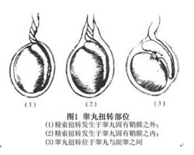 睪丸扭轉(torsion of testis)又稱精索扭轉,由于劇烈運動或暴力損傷陰囊時,螺旋狀附著于精索上的提睪肌強烈收縮,導致扭轉并引起睪丸的急性血液循環障礙。臨床并不罕見,往往發生于先天性睪丸系膜過長、睪丸引帶發育不良、隱睪、睪丸下降不全、附睪與睪丸連接不完全、附睪與部分精索過度活動、精索過長等情況。常分為鞘膜內型和鞘膜外型兩種。睪丸扭轉方向多由外向內。而扭轉發生在睪丸和附睪之間的情況則很少見。
