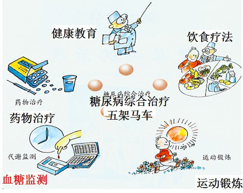 五駕馬車說的是糖尿病的治療:第1駕馬車是 飲食治療:是每個糖尿病病人治療的基礎。第2駕馬車是運動:輔助飲食治療,降低血糖,提高整體健康水平。第3駕馬車是降糖藥物:在飲食治療的基礎上,改善體內糖代謝過程,力爭達到接近正常人的血糖水平,既保證人體能量所需,又利于達到各項控制指標。第4和第5駕馬車是糖尿病教育和病人自我監(jiān)測血糖:是以上治療措施能否正確實施的保障。監(jiān)測血糖如同高血壓病人監(jiān)測血壓一樣重要,是判斷治療效果和調整治療方案最直接的證據。