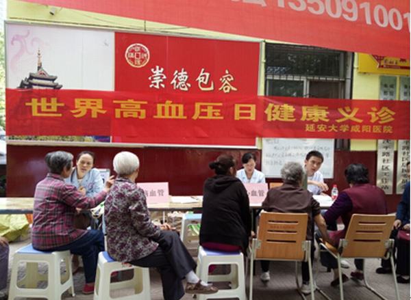 在咸陽市西蘭路街道辦社區服務中心門口的宣傳義診點,醫護人員為前來咨詢的群眾發放宣傳資料、免費測量血壓、講解高血壓的診斷標準、主要臨床表現、長期高血壓的危害、指導高血壓用藥及如何在日常生活中通過健康生活方式控制血壓。居民們表示受益匪淺,受益群眾達100多人次。