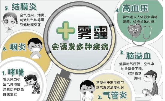 霧霾天氣時霧霾顆粒會刺激呼吸道,出現(xiàn)咳嗽、悶氣、呼吸不暢等,極易誘發(fā)包括支氣管哮喘、支氣管炎、過敏性鼻炎和變異性咳嗽等。有環(huán)保專家分析,灰霾很可能取代吸煙成為肺癌頭號致病“殺手”。