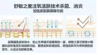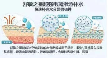 舒敏之星能將補充給皮膚的水分電離成離子狀態,并通過同極離子相斥的作用原理,將離子水在5秒內直接導入到皮膚的基底層,為干燥肌膚提供了補水、輸水、鎖水,達到重建皮膚水環境目的。