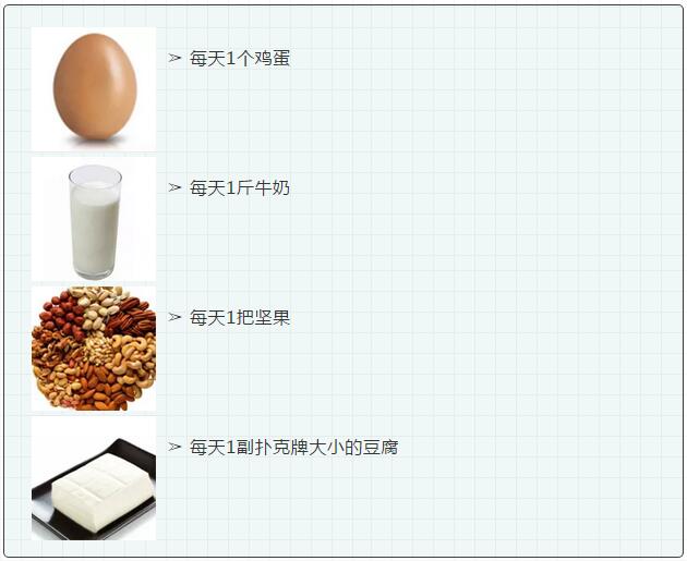 宜:《中國居民膳食指南》(2016)建議每天喝一杯奶,或相當于300g的液態奶制品;每天吃25-35g大豆及堅果類,25g大豆相當于365g豆漿的量。