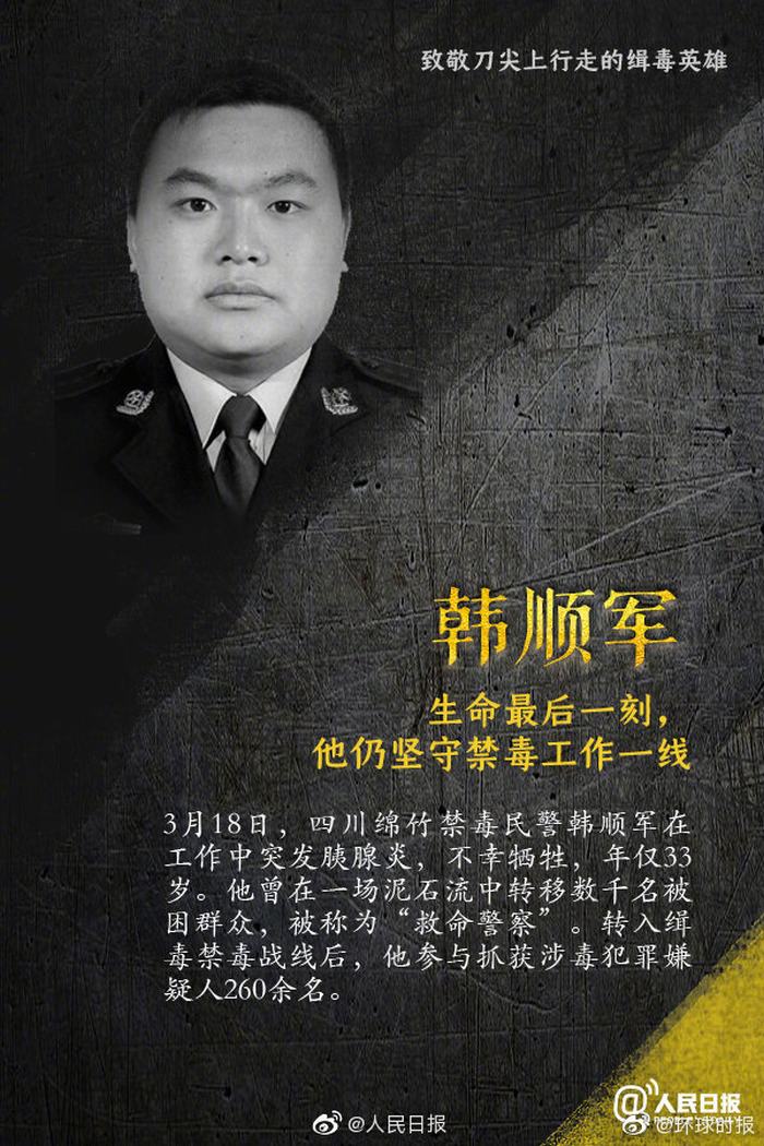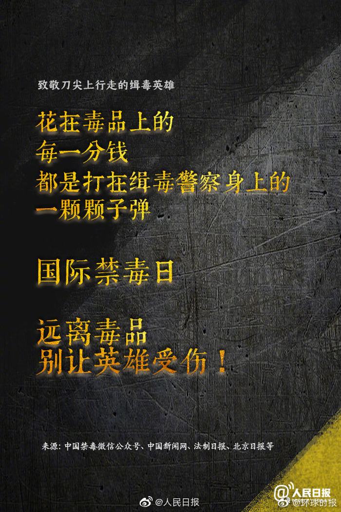 和平年代,禁毒被視為犧牲最大、最慘烈的戰爭。為了打贏這場戰爭,無數緝毒警察不僅時刻面臨犧牲家庭和身體健康的風險,還可能奉獻自己的生命。請記住:花在毒品上的每一分錢,都是打在緝毒警察身上的一顆顆子彈。今天,國際禁毒日,遠離毒品。