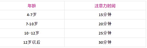 一般而言,各年齡段兒童能集中注意的平均時間如下圖所示: