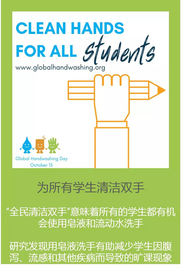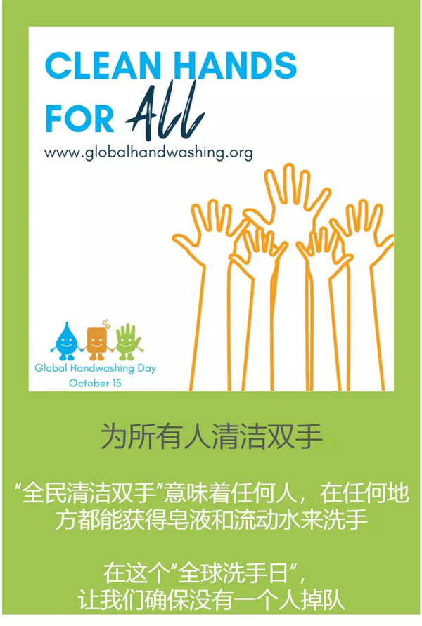 今年的全球洗手日主題為“全民清潔雙手(clean hands for all)”,旨在全面推動(dòng)可持續(xù)發(fā)展的議程,爭(zhēng)取在一年時(shí)間的推動(dòng)下,不讓任何人掉隊(duì)。