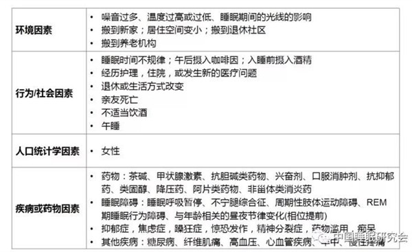 多種因素均會(huì)增加老年人發(fā)生失眠的風(fēng)險(xiǎn),包括環(huán)境、行為、疾病、人口統(tǒng)計(jì)學(xué)和社會(huì)因素等(詳見下表)。