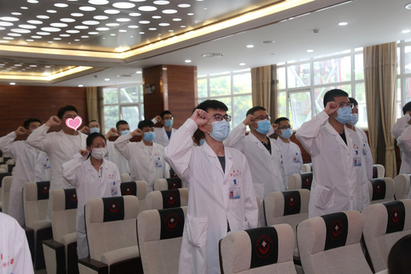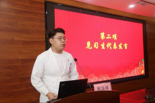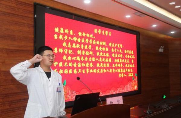 隨后,程鈺琦同學(xué)代表全體學(xué)生進(jìn)行發(fā)言,他表示,在新的環(huán)境下要繼續(xù)發(fā)揚(yáng)延安大學(xué)的艱苦奮斗精神,不斷加強(qiáng)自我修養(yǎng),提高品格,培養(yǎng)自主學(xué)習(xí)和獨(dú)立思考解決問題的能力,圓滿完成見習(xí)期間的各項(xiàng)任務(wù),以優(yōu)異的成績(jī)回報(bào)醫(yī)院、學(xué)校和社會(huì)。接著,楊佳同學(xué)帶領(lǐng)全體見習(xí)生領(lǐng)誦《醫(yī)學(xué)生誓言》,所有見習(xí)生舉起右手莊嚴(yán)宣誓,立志為醫(yī)學(xué)事業(yè)奮斗終生。
