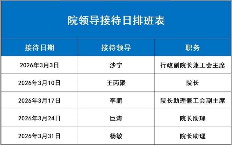 為進一步提升醫療質量與安全,優化服務流程,改善群眾就醫體驗,我院常態化開展“院領導接待日”活動。院領導將面對面接待來訪,傾聽意見、解答疑問,以實際行動踐行“醫院領導要把職工的利益放在第一位,全院職工要把患者的需求放在第一位”的服務宗旨。現將2026年3月“院領導接待日”具體安排公示如下: